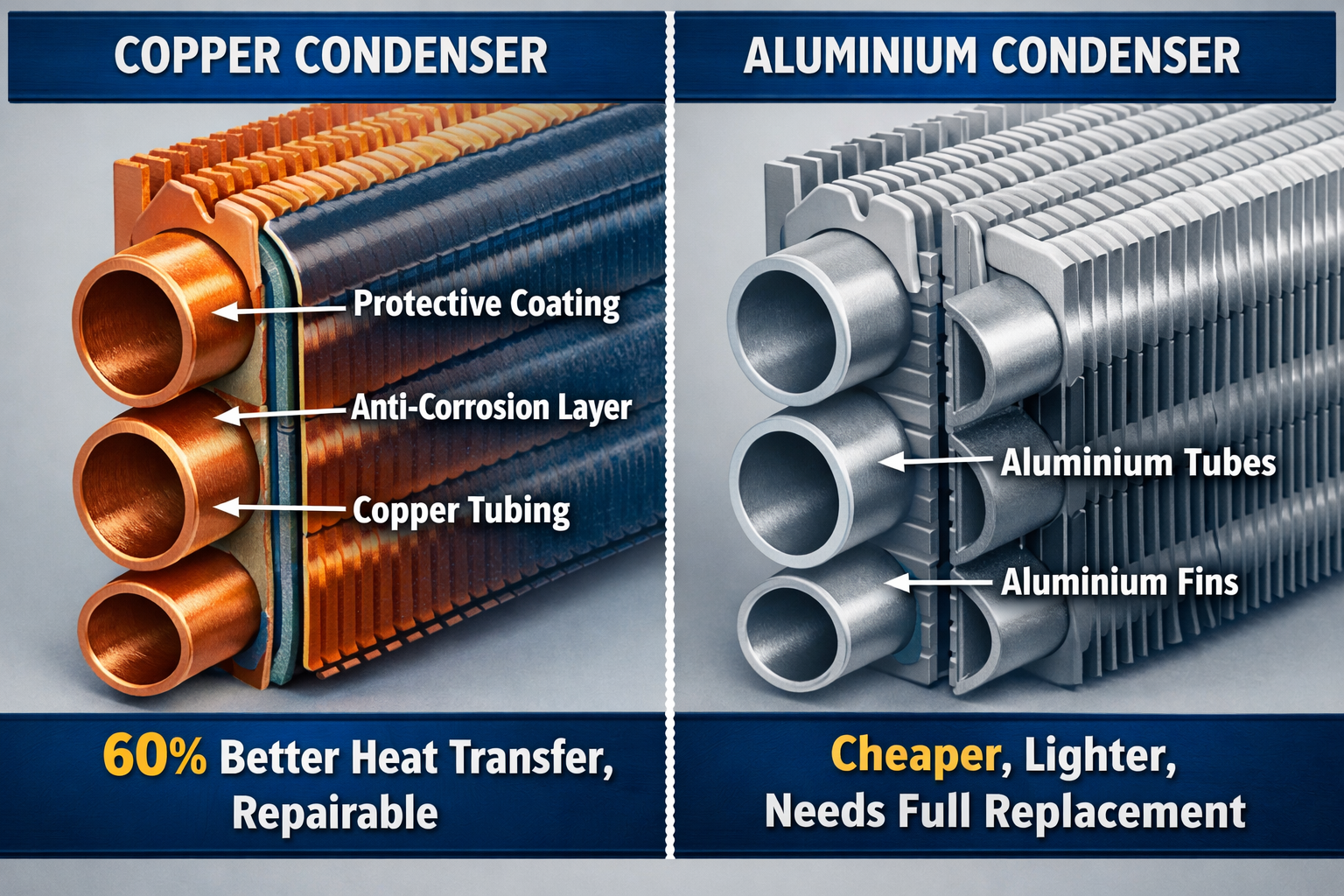 Read the Full Comparison →→4. Copper vs Aluminium Condenser — And Why the Coating Matters More