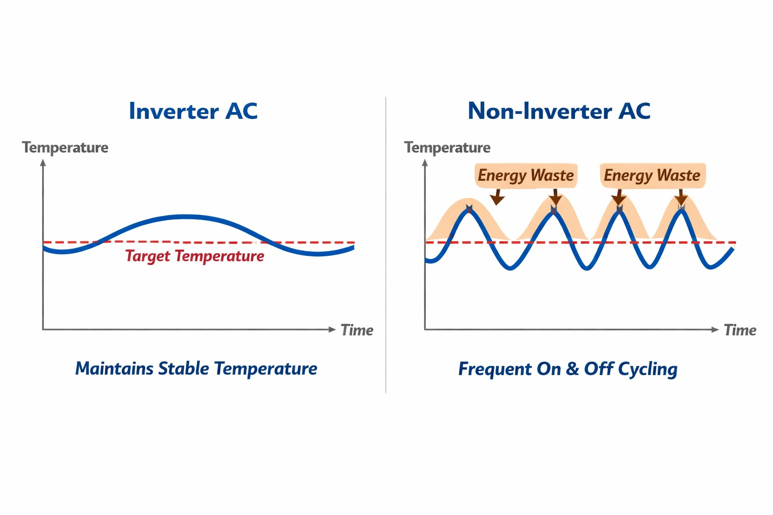 Non-inverter ACs run the compressor at full speed, then shut it off when the room cools, then restart — causing temperature swings, noise spikes, and higher bills. Inverter ACs adjust compressor speed continuously, maintaining a steady temperature.