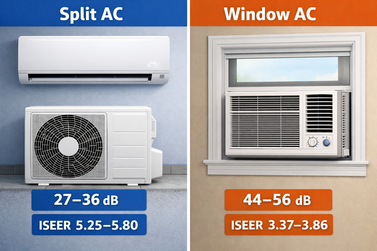 Split ACs are quieter (27–36 dB vs 44–56 dB), more efficient, and better-looking. Window ACs are cheaper to buy and install, and don't need wall drilling. For bedrooms and living rooms, go split. For rentals, old buildings, or utility rooms, window works fine. See our full split vs window AC guide for details.