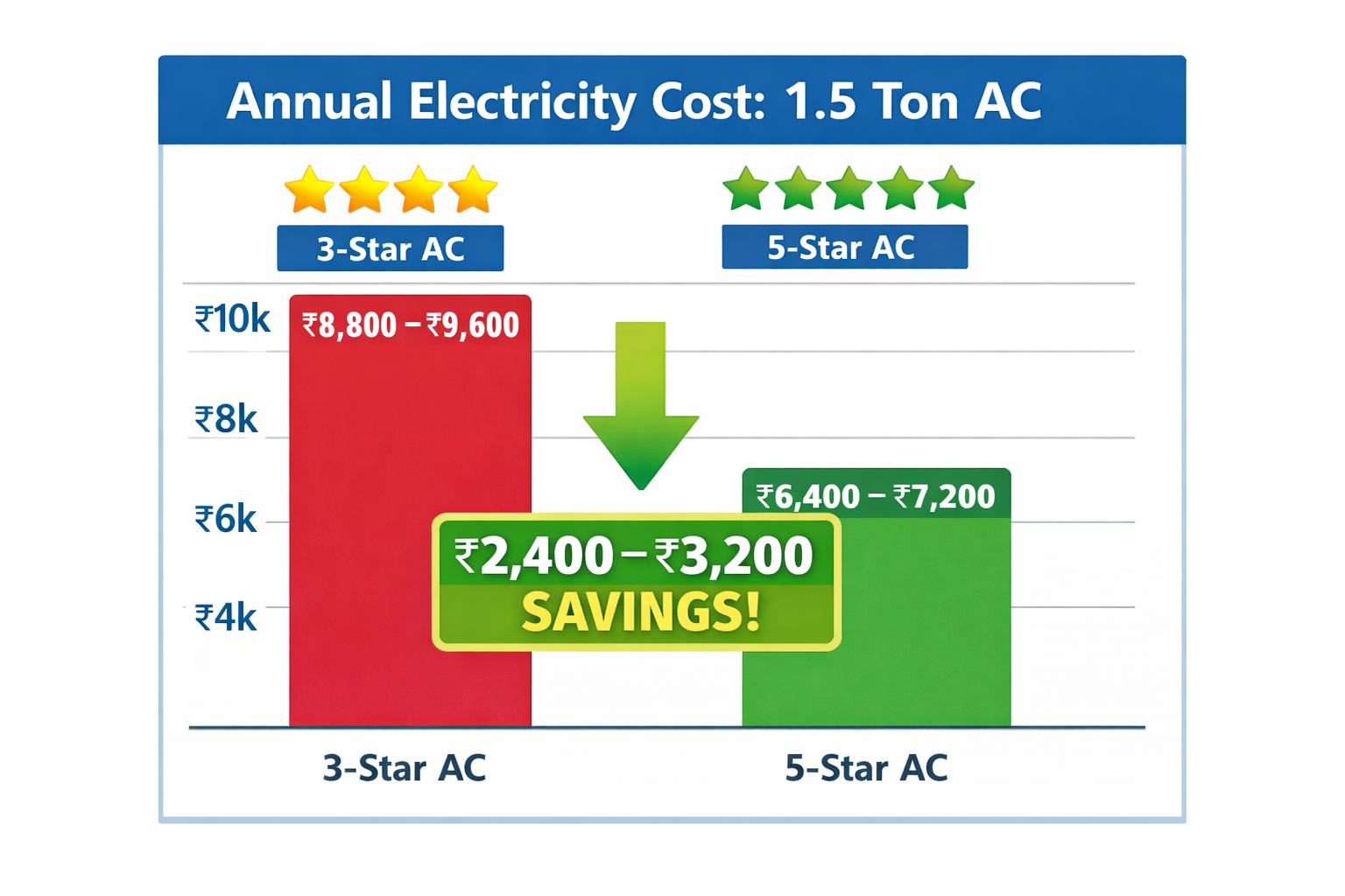 Use the Tonnage Calculator →→2. Star Rating — 3-Star vs 5-Star Is a ₹2,000–3,000/Year Decision