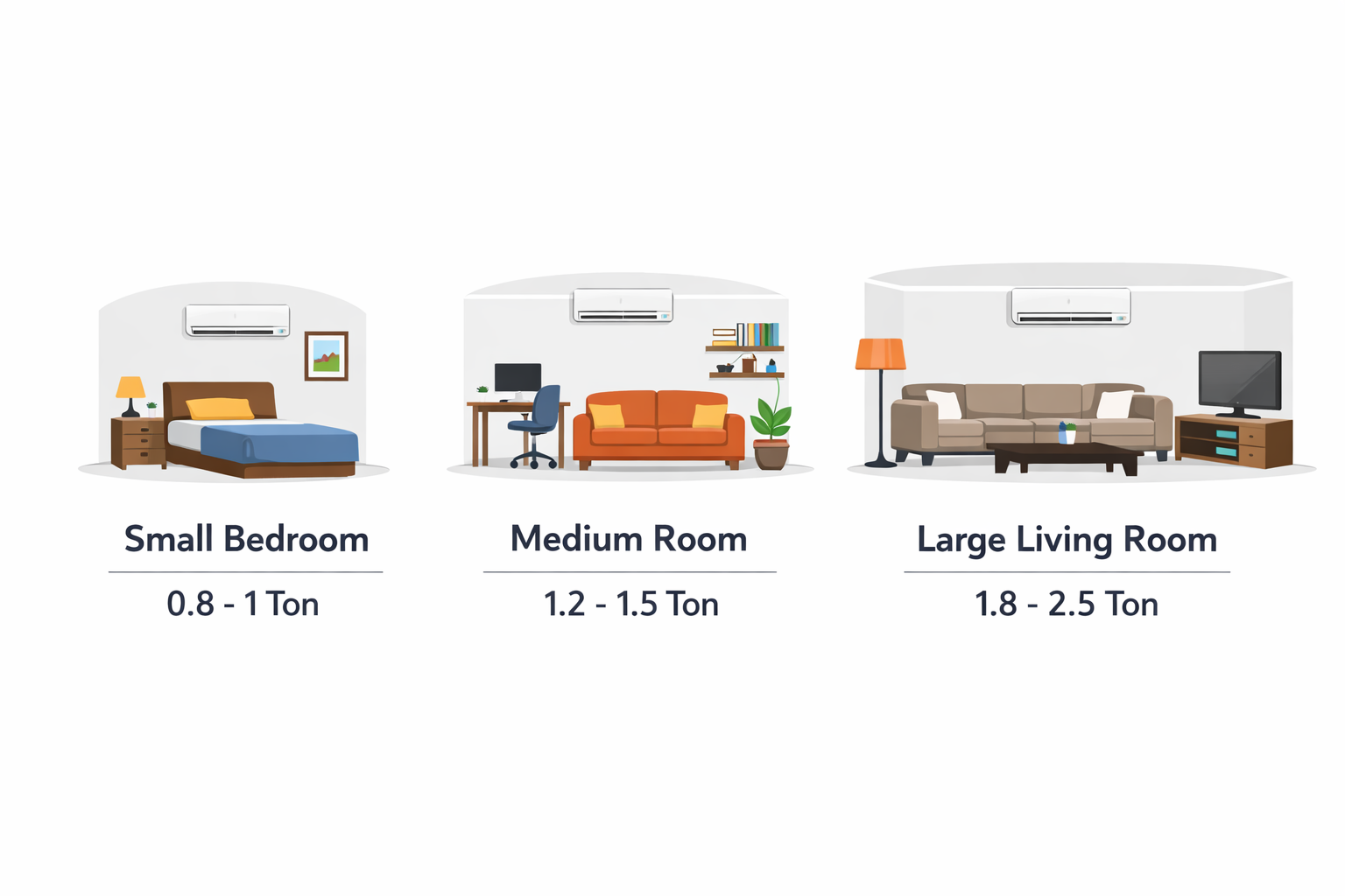 Tonnage is the cooling capacity of your AC. An undersized AC will run non-stop and still not cool the room. An oversized AC will short-cycle — cooling too fast, shutting off, restarting — wasting energy and wearing out the compressor.
