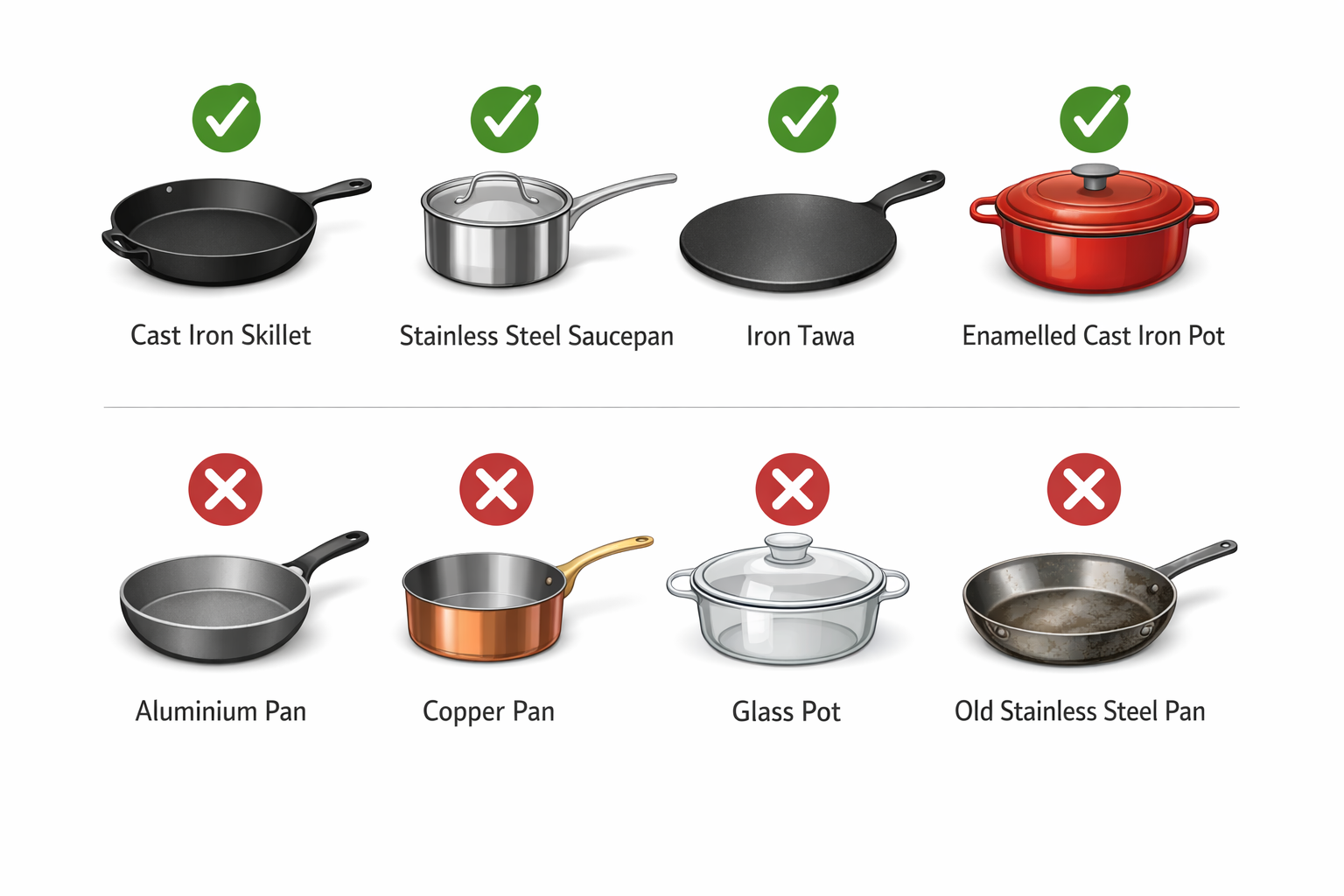- Any ferromagnetic cookware works — cast iron tawas you already own are perfect