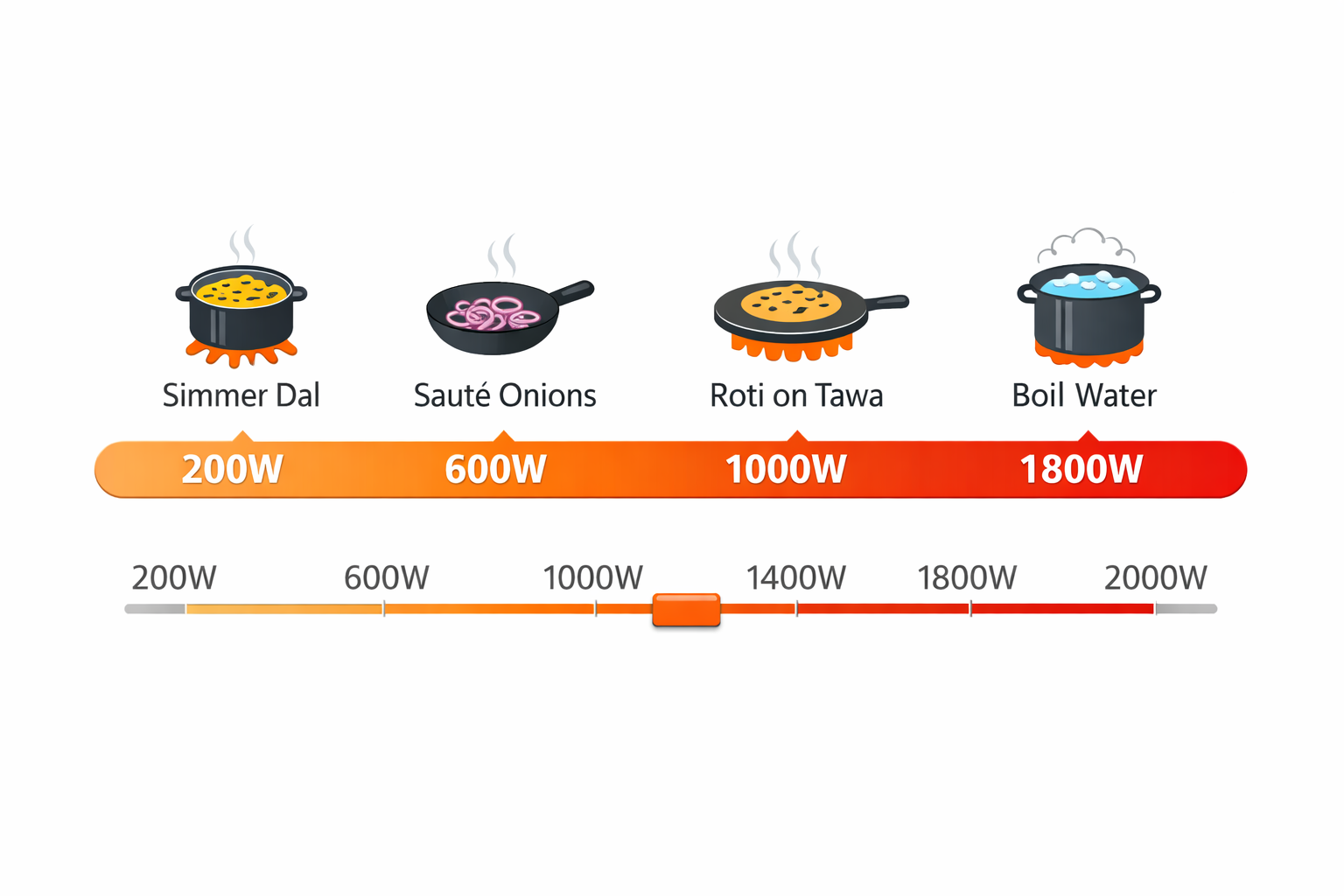 - 1600-2000W: Boiling water, pressure cooking