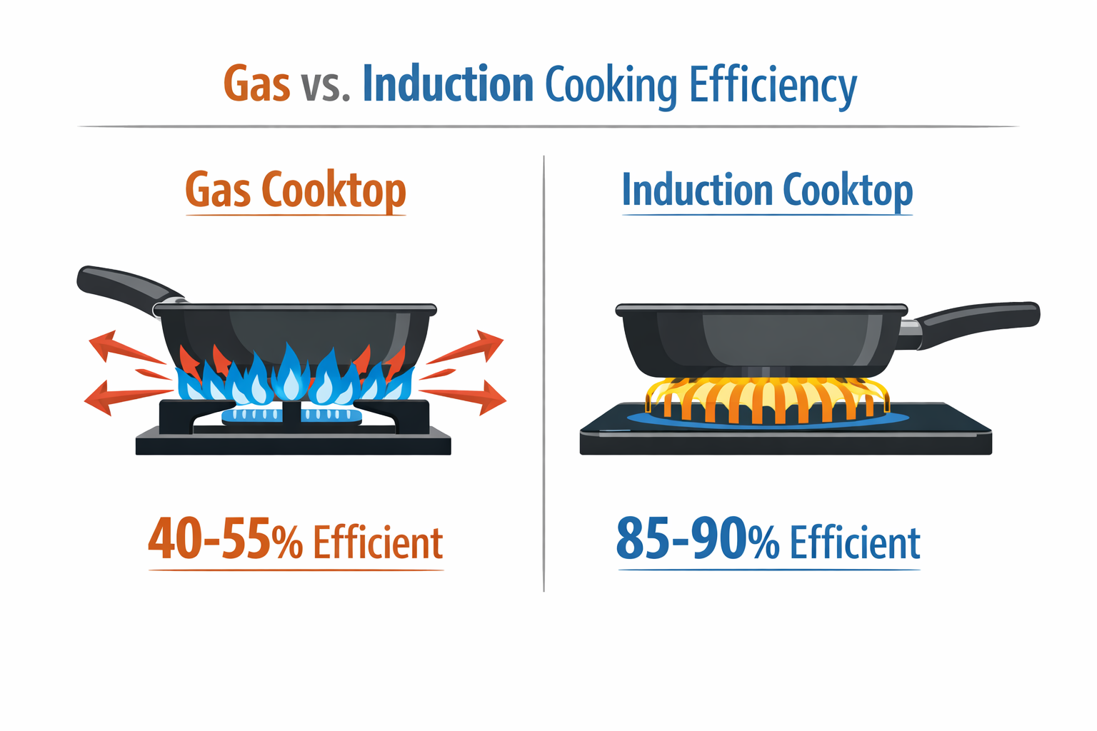 - Induction heats the pan directly through magnetic fields — 85-90% efficient vs 40-55% for gas
