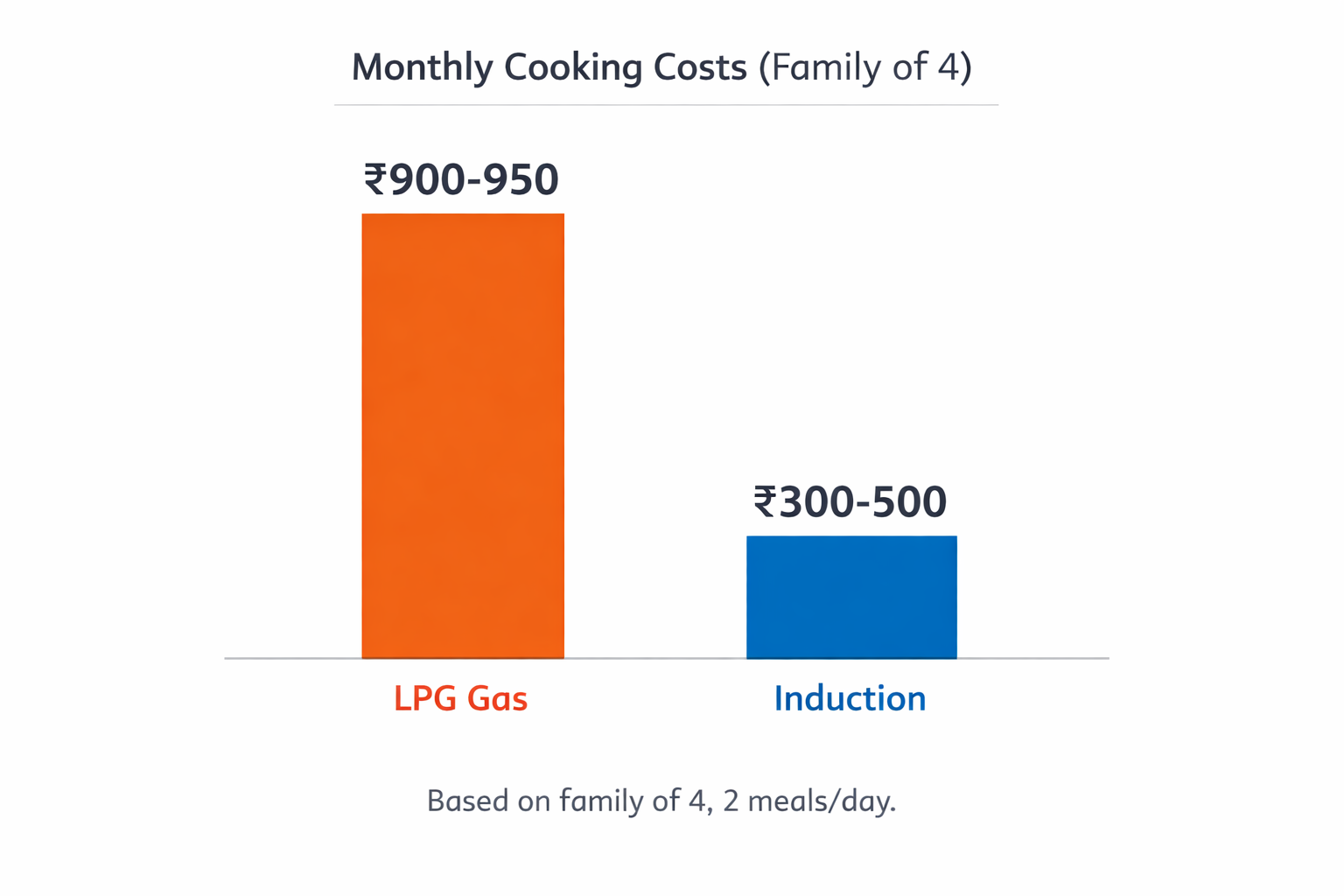 - Monthly cost is 40-60% lower than LPG for the same meals
