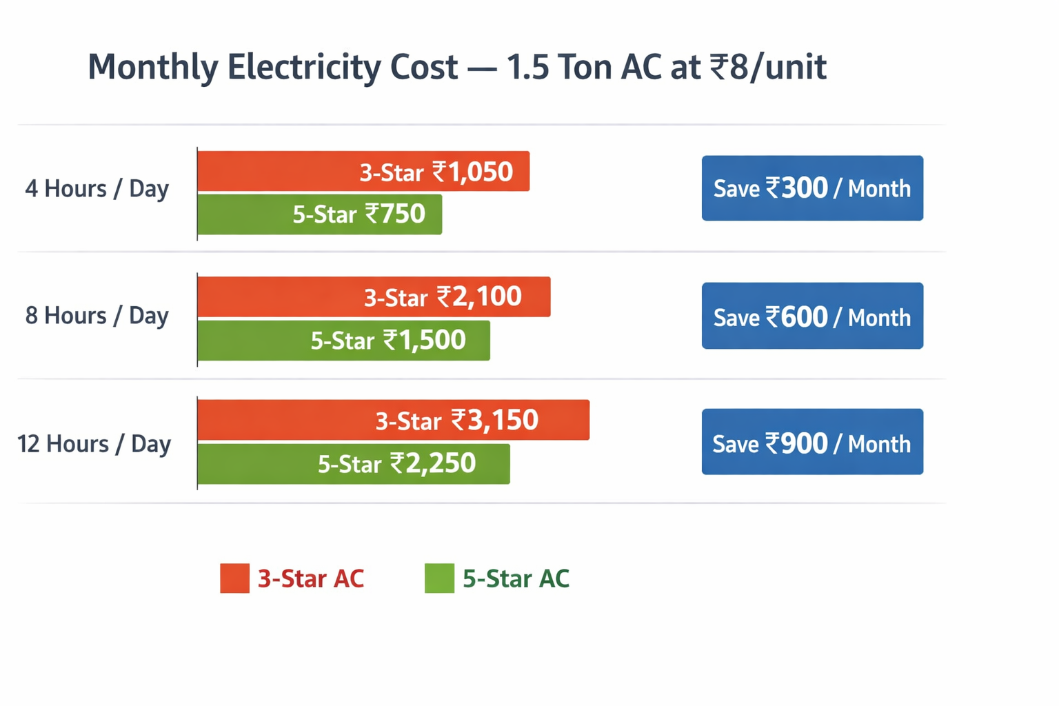At 8 hours daily usage and ₹8/unit electricity rate, a 5-star 1.5 ton AC saves approximately ₹600/month or ₹3,000 per summer season compared to a 3-star model. Over the AC's 8–10 year lifespan, this adds up to ₹24,000–30,000 in savings — well above the ₹8,000–12,000 upfront premium.