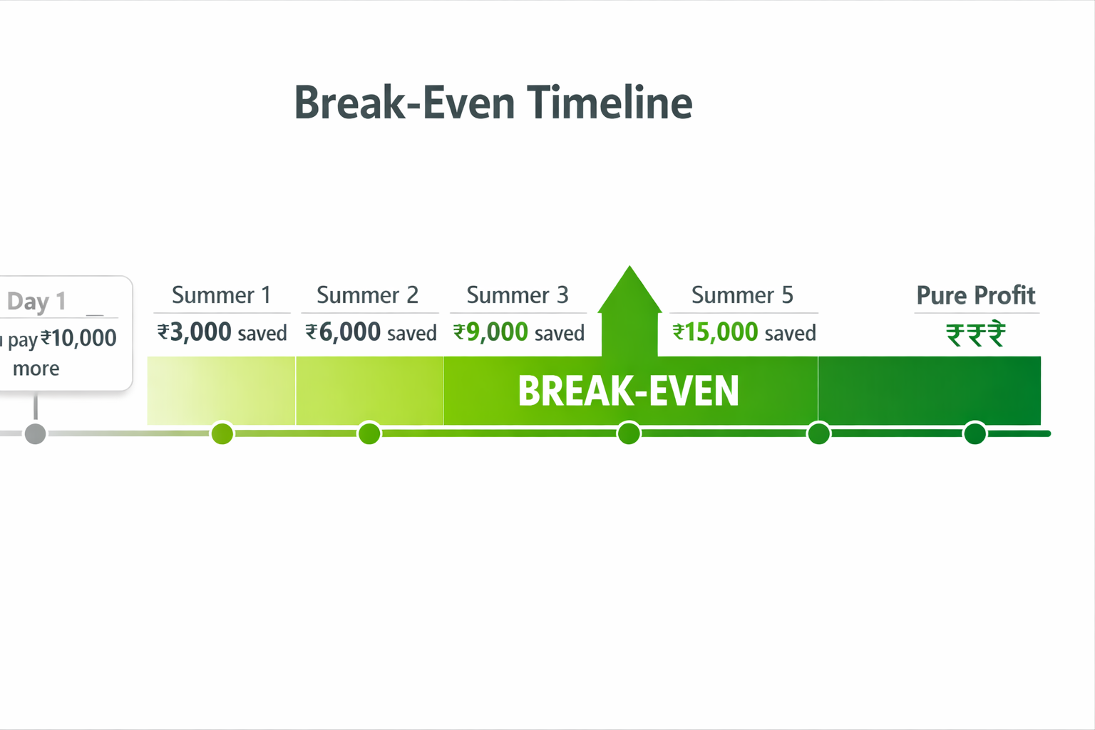 The upfront premium for 5-star over 3-star is typically ₹8,000–12,000 for the same brand and model line. Here's how long it takes to recover that through electricity savings: