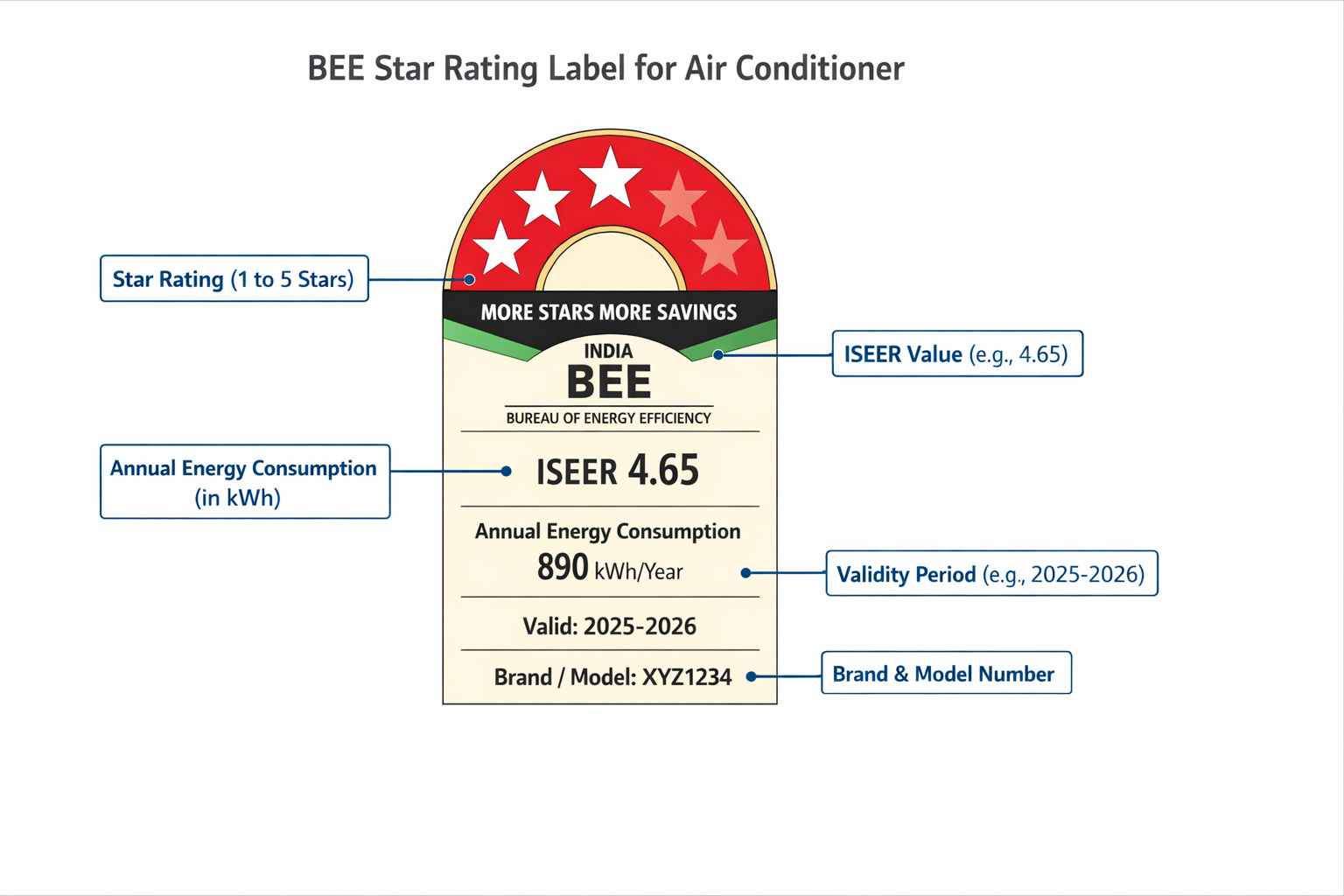 The BEE (Bureau of Energy Efficiency) star rating is based on a metric called ISEER — Indian Seasonal Energy Efficiency Ratio. It measures how many watts of cooling the AC produces per watt of electricity consumed, averaged across an entire Indian summer season.