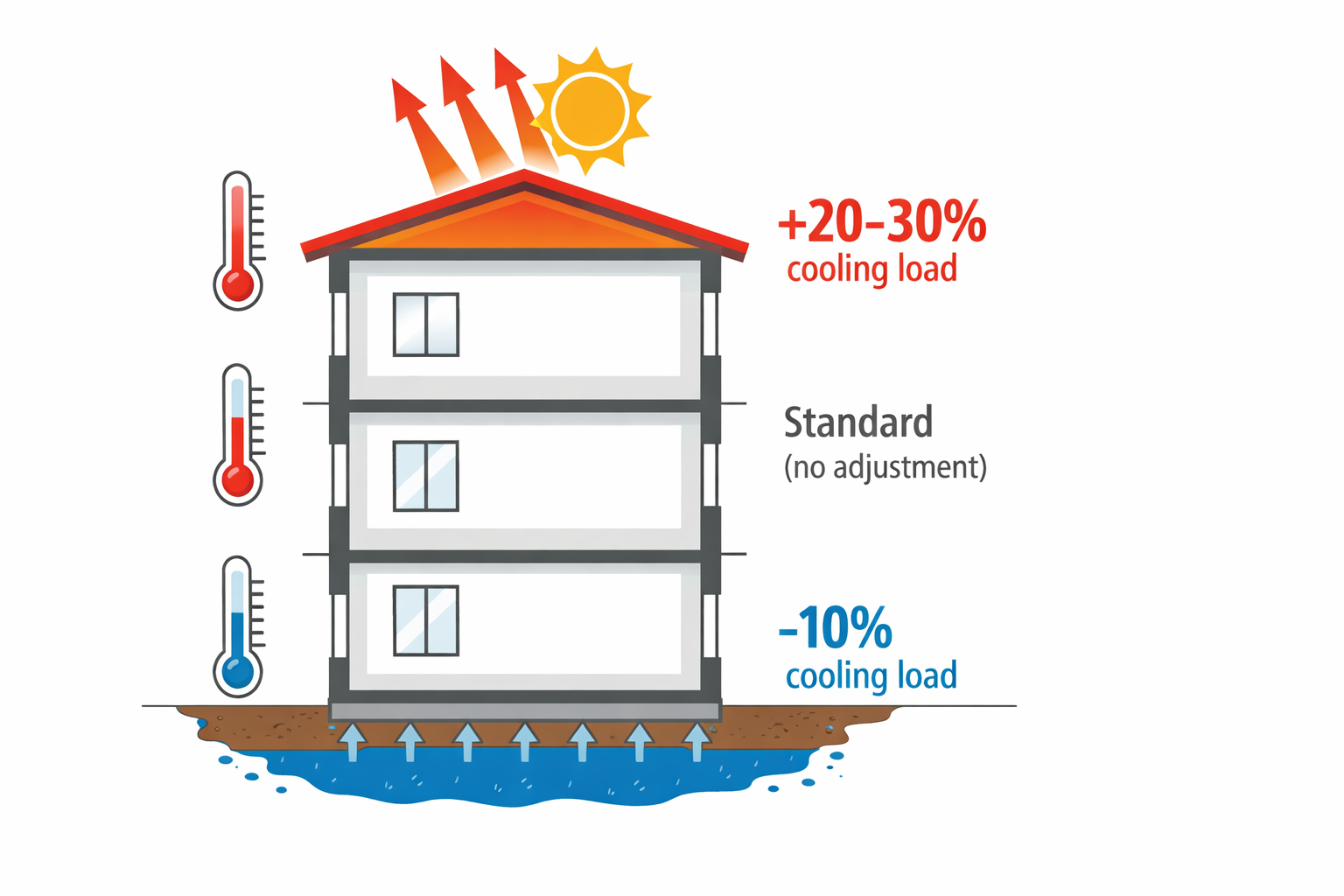 | Ground floor | Standard or -10% | Often shaded, cooler ground contact |