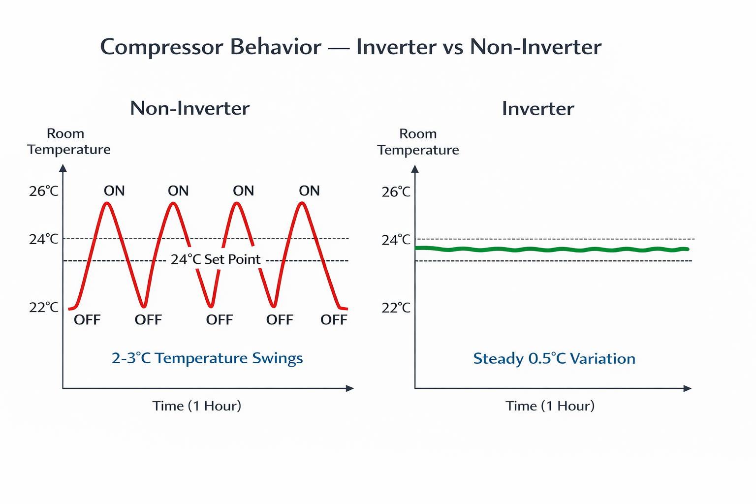 A non-inverter (fixed-speed) AC has a compressor with two states: full power and off. When your room hits the set temperature, the compressor shuts off completely. When the temperature rises 2–3°C above your setting, it kicks back on at full blast. This constant cycling is why you feel alternating waves of cold and warm air.