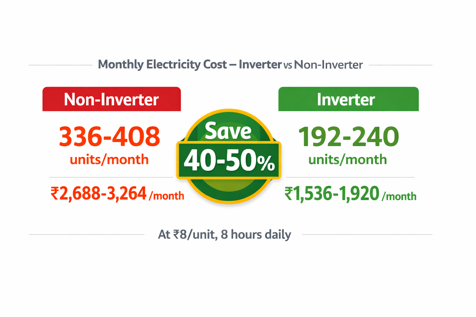 | Monthly bill (₹8/unit) | ₹1,536–1,920 | ₹2,688–3,264 |