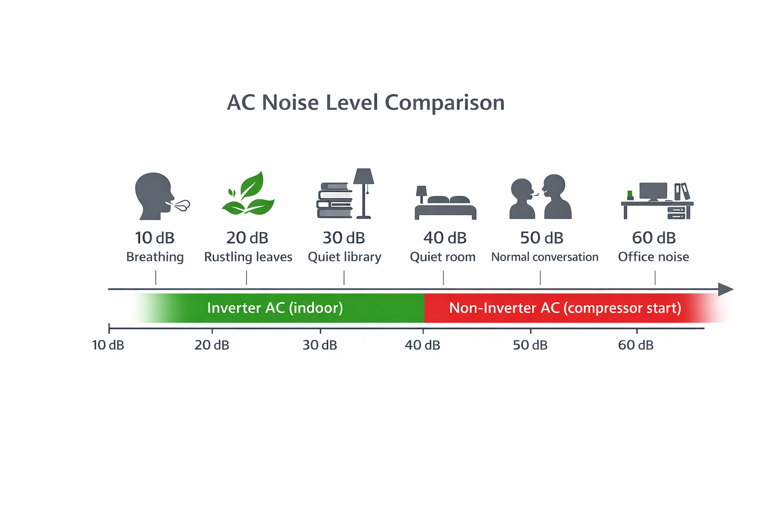 A non-inverter compressor starting up produces a distinct thump followed by a hum at 48–52 dB. When it shuts off, there's another noticeable click. This cycle repeats every 15–20 minutes throughout the night.