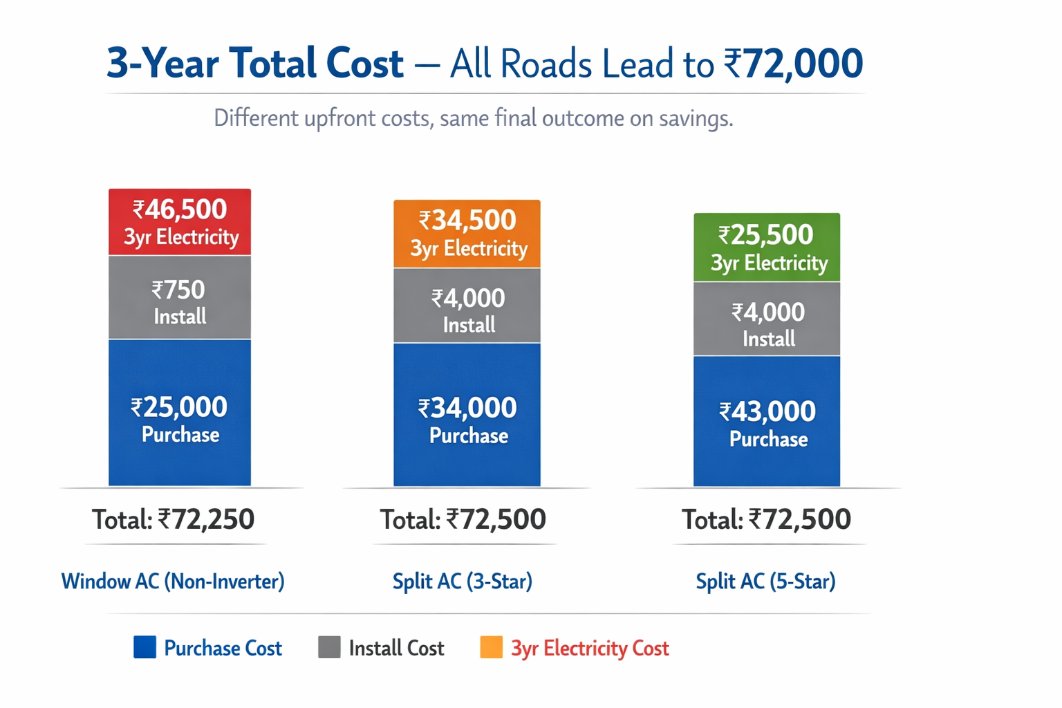 The 3-year total cost is remarkably similar. The window AC is cheaper upfront but its higher electricity consumption catches up quickly. Over 5+ years, the split AC (especially 5-star) becomes definitively cheaper.