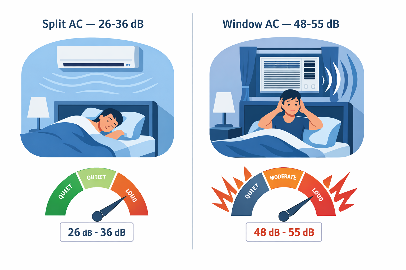Choosing a window AC for the bedroom — The noise difference between a window AC (50+ dB) and a split AC indoor unit (28–35 dB) is enormous at 2 AM. If sleep quality matters, the split AC premium is worth it for the bedroom.