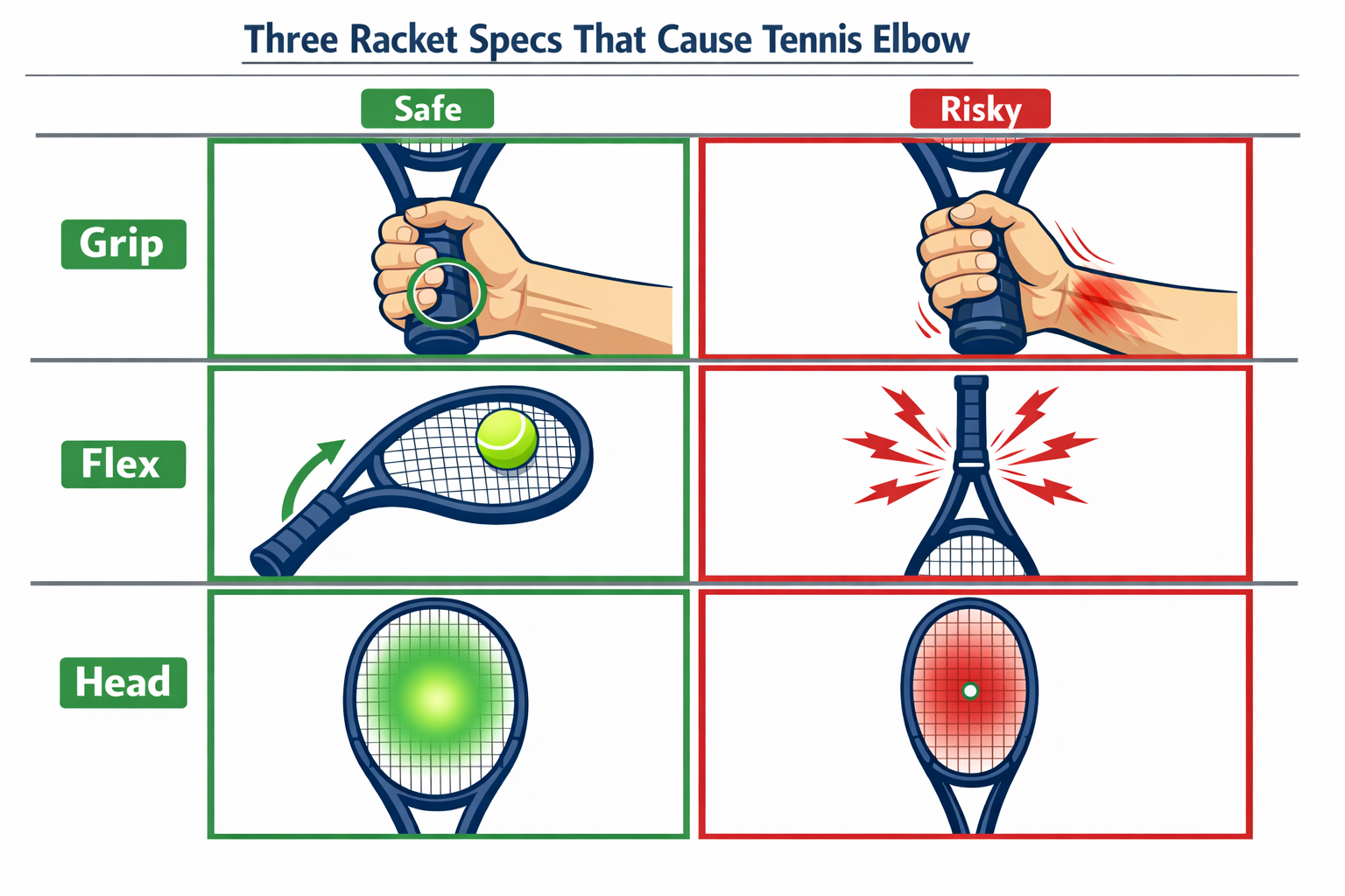 Up to 50% of regular tennis players get tennis elbow. Your racket specs may be the biggest reason — not how much you play.